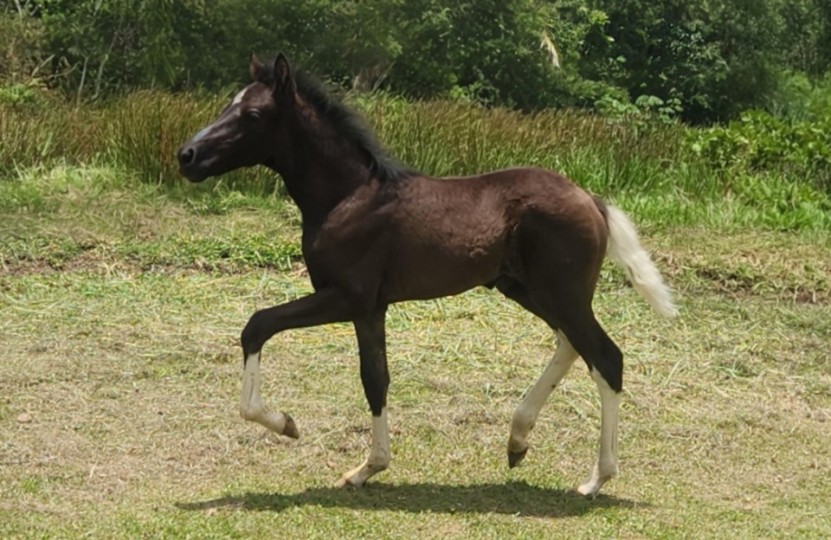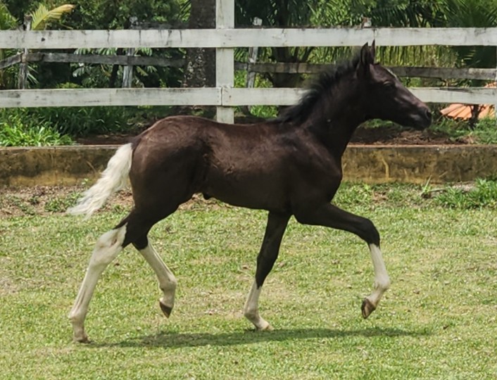AL CAPONE DA EVOLUÇÃO : Este potrinho lindíssimo tem tudo que um criador procura, é preto pampa, pelagem lindíssima e hiper valorizada. Uma potraço em todos os sentidos, além da pelagem exótica, é um potro excepcional de morfologia, dentro do melhor padrão da raça, aprumos perfeitos, espádua inclinada, frente lançada e ótimo arqueamento de costelas, boa ligação de dorso lombo e uma lindíssima expressão racial. Apresenta um andamento diagramado, com anteriores rolados e posteriores forte, vai com certeza ser um sucesso nas pistas depois de montado no futuro. Na genética ela também vai agradar aos criadores mais exigentes. Seu pai, Herdeiro JEA ( foto 4 )  é um raçador pampa de preto homozigoto neto do Vermute JEA que foi Campeão Nacional e é considerado um dos melhores avôs da atualidade na raça. A mãe de Al Capone, Kanela da Evolução ( foto 5 ) é uma doadora negra super consagrada filha do grande Jabuti da Mandassaia. Portanto, este potrinho é para quem está escolhendo com muito carinho uma potro extraordinário, com enorme potencial para depois de montado e para ser chefe de plantel na reprodução no futuro. ATENÇÃO : O comprador leva o potro no desmame aos 5 meses em março de 2026.